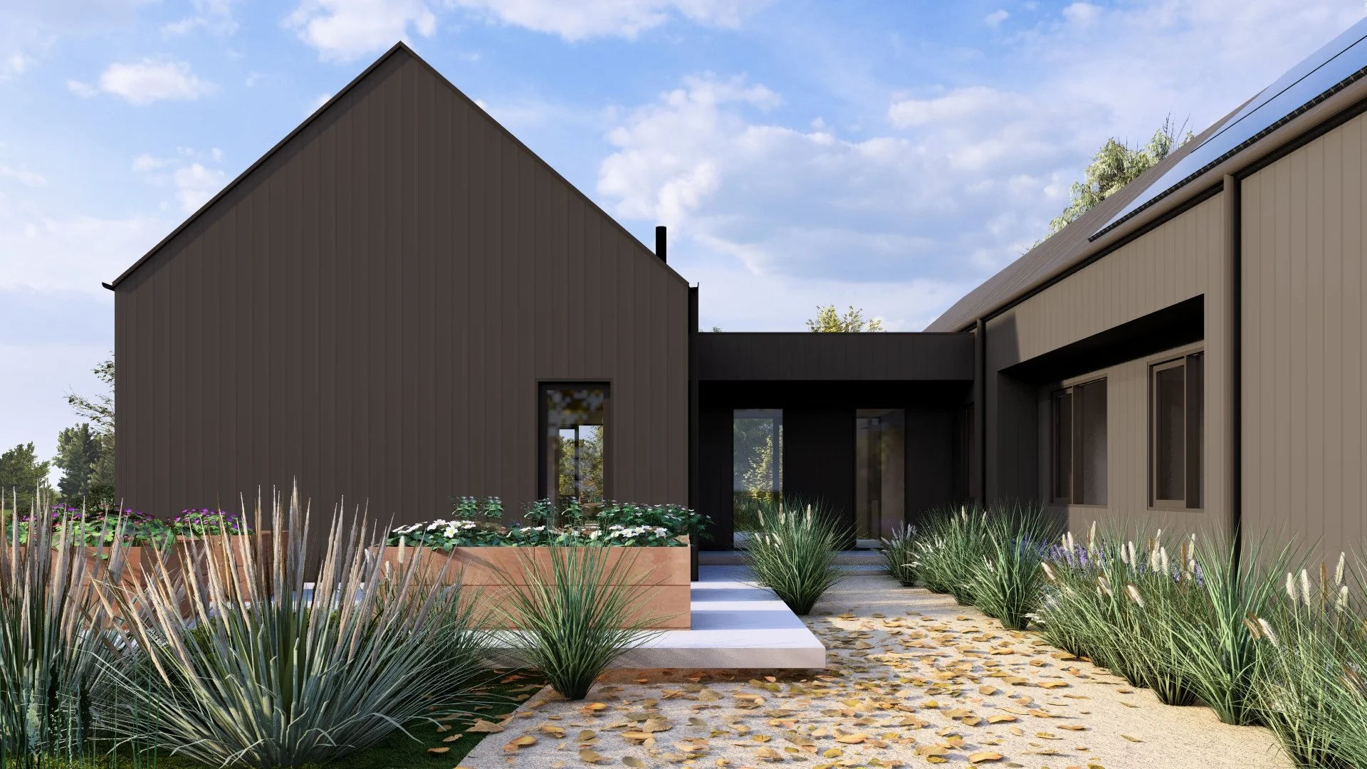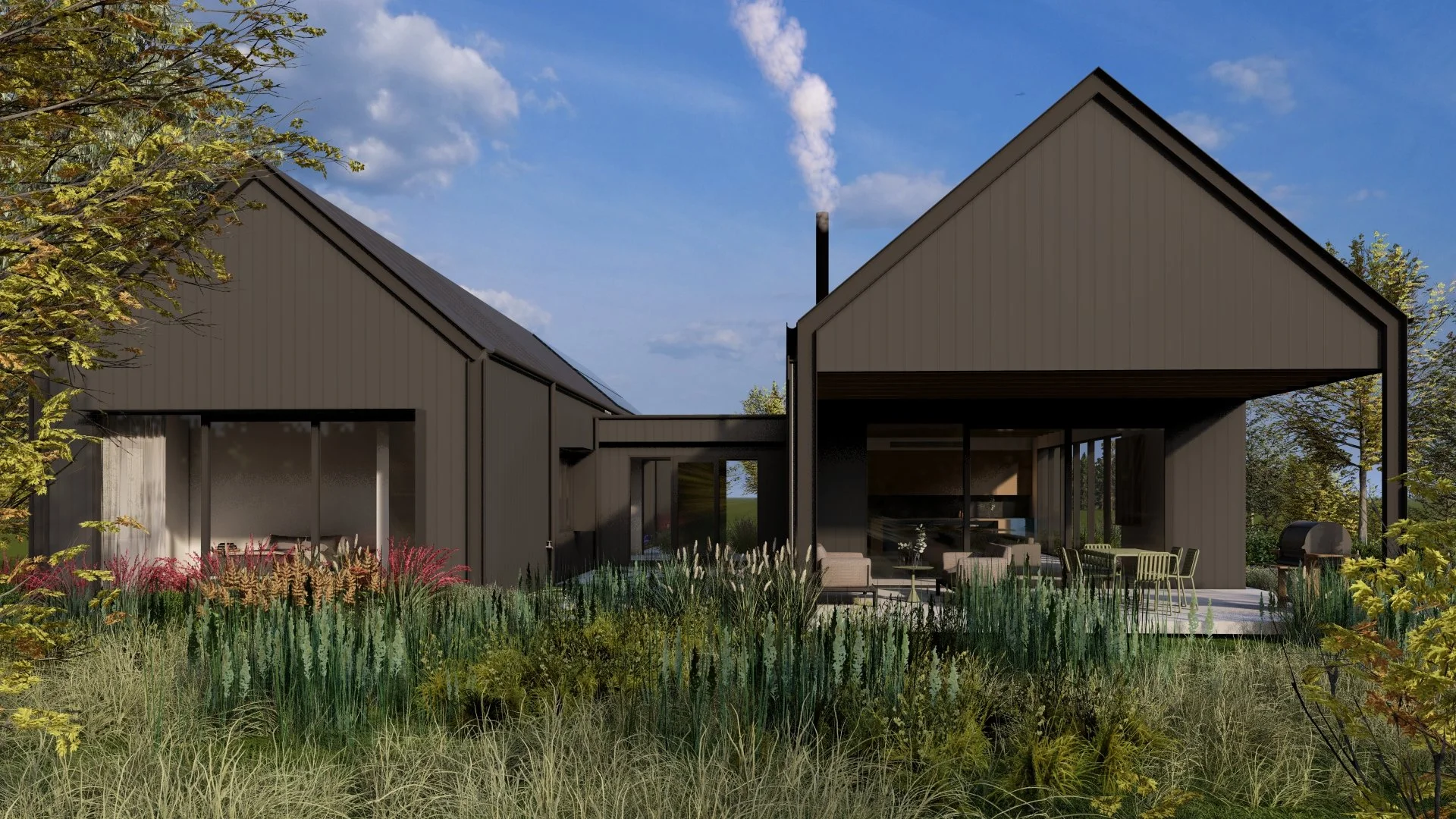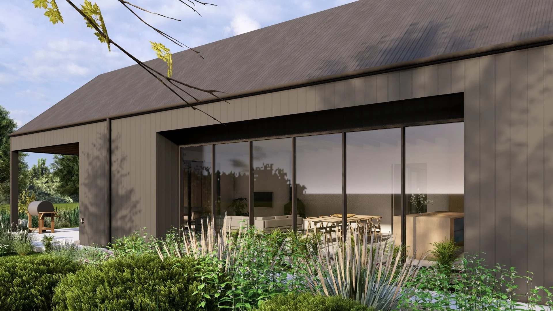 The architectural form draws on a modern interpretation of agrarian sheds, using restrained detailing and a muted material palette to sit comfortably within the regional context. Vertical cladding, deep window reveals and covered alfresco areas create strong indoor-outdoor relationships while offering protection from sun and weather — ideal for rural living in the Macedon Ranges climate.