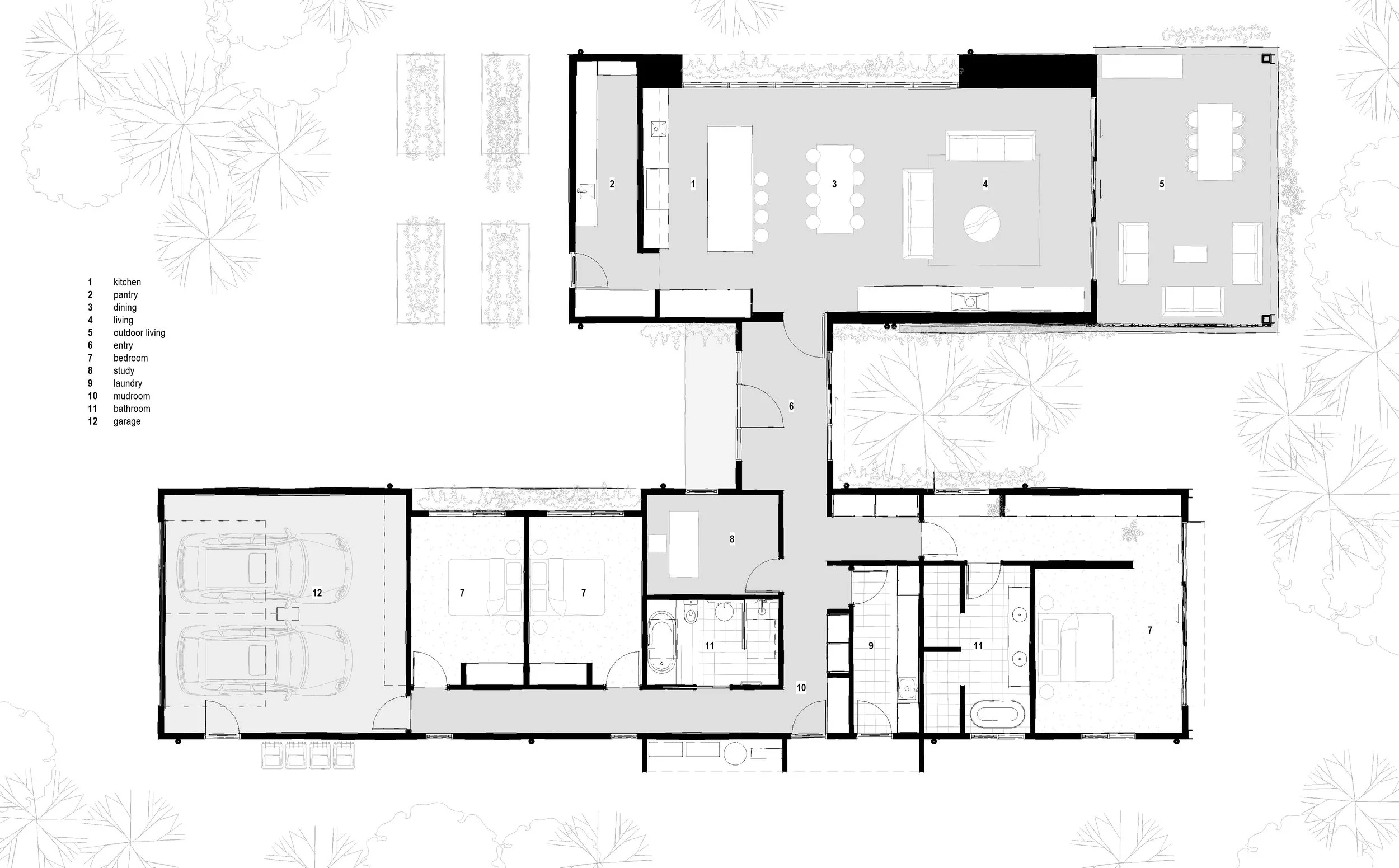 This contemporary rural home in Kyneton South, within Victoria’s Macedon Ranges, is conceived as a collection of simple gable pavilions linked by glazed connections and sheltered outdoor zones. The planning separates private bedroom wings from generous open-plan living spaces, balancing retreat with connection and creating a home that feels both expansive and intimate within its landscape setting.