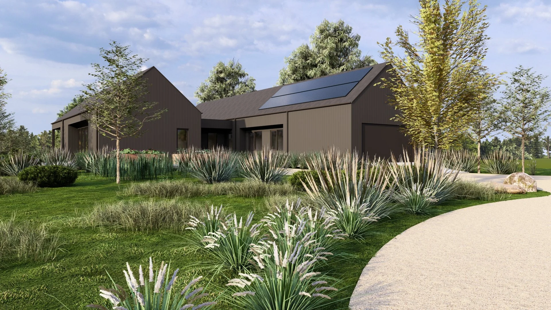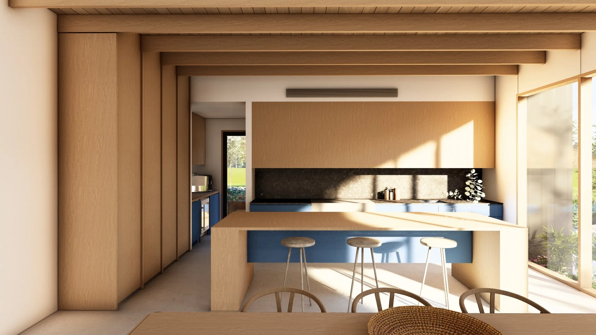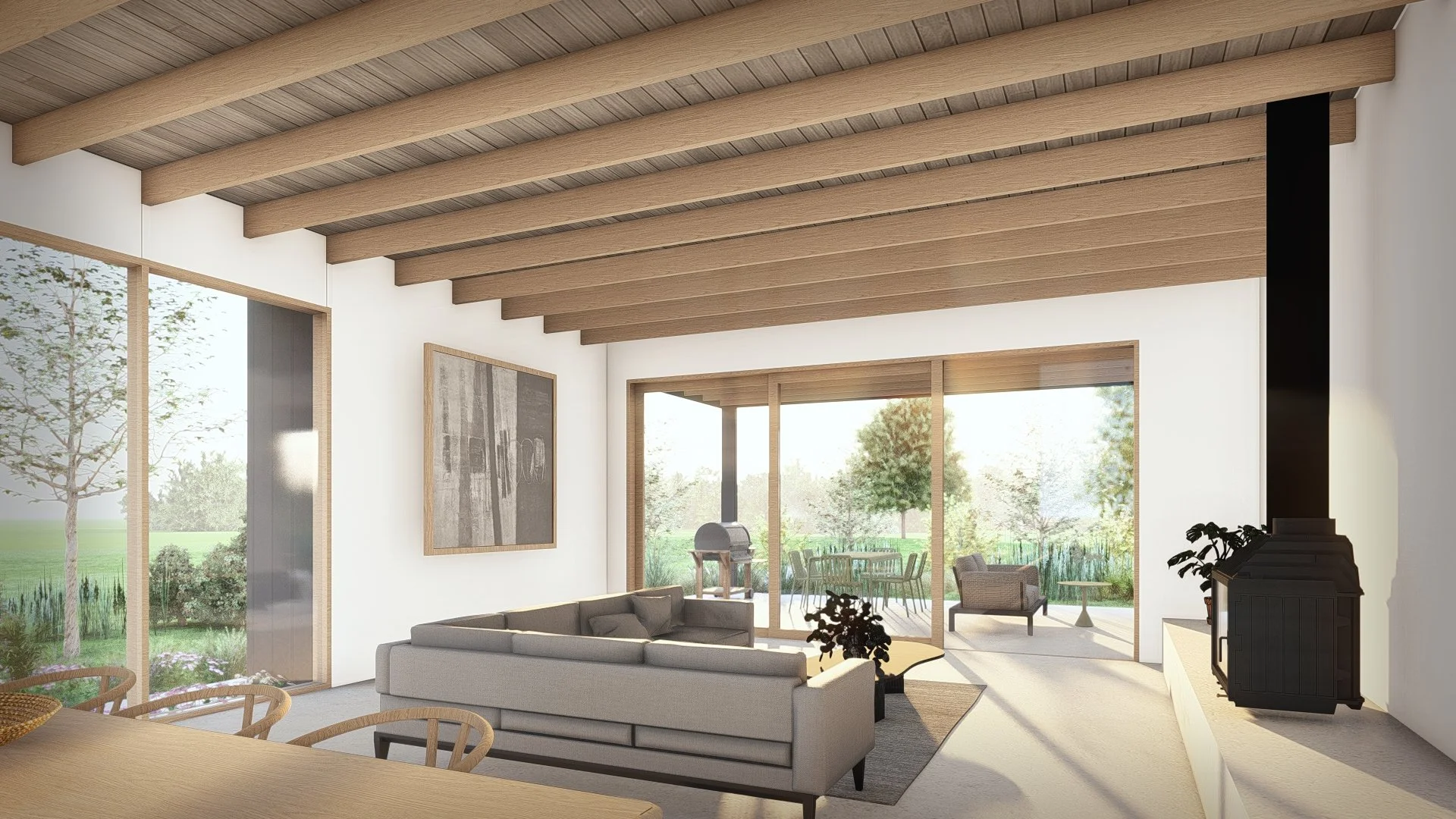 Sustainability is embedded throughout the design, including solar orientation, rooftop photovoltaic panels, high-performance glazing and deep eaves for passive shading. Cross-ventilation, energy-efficient systems and durable low-maintenance materials all contribute to a high-performing rural home designed for long-term environmental resilience in the Macedon Ranges region.